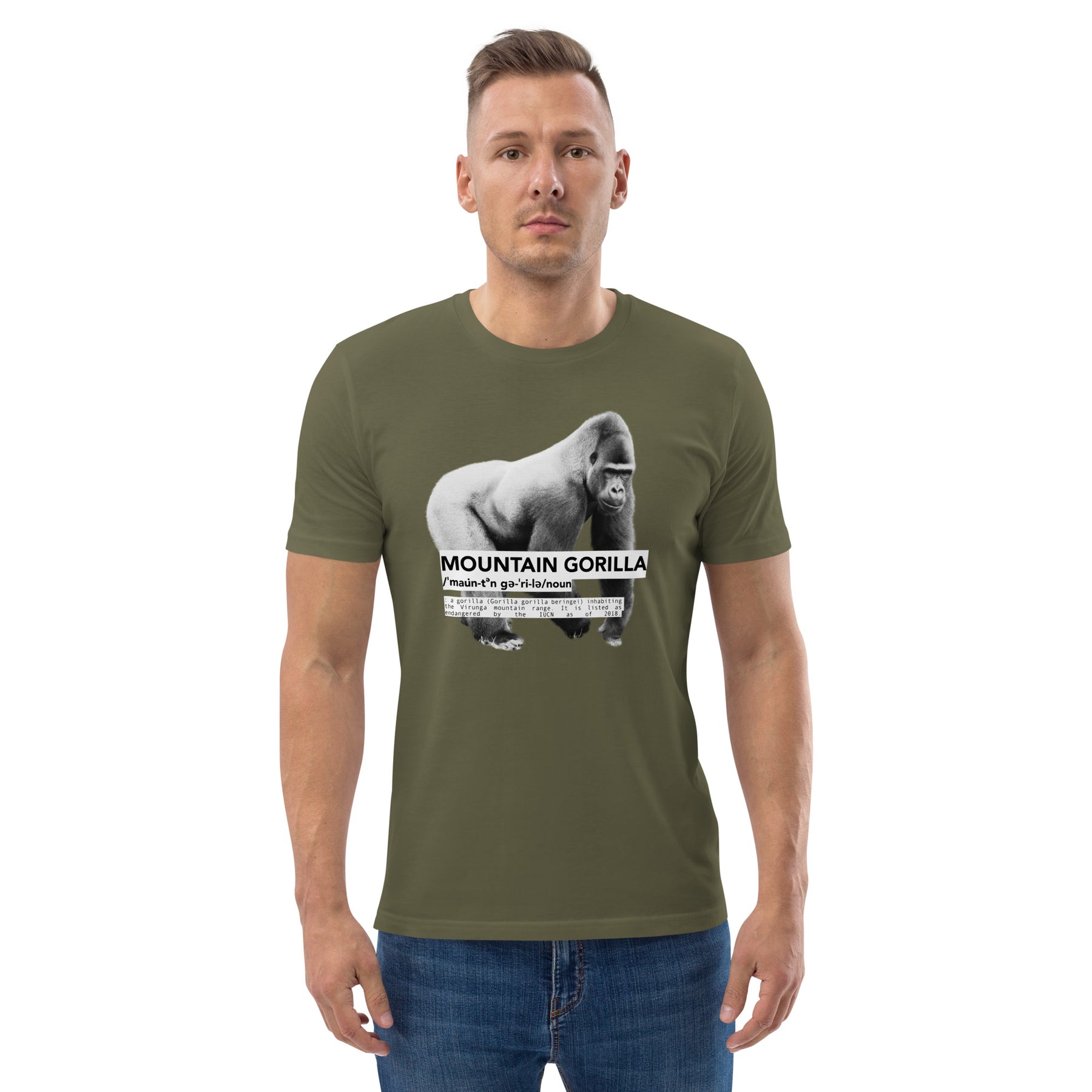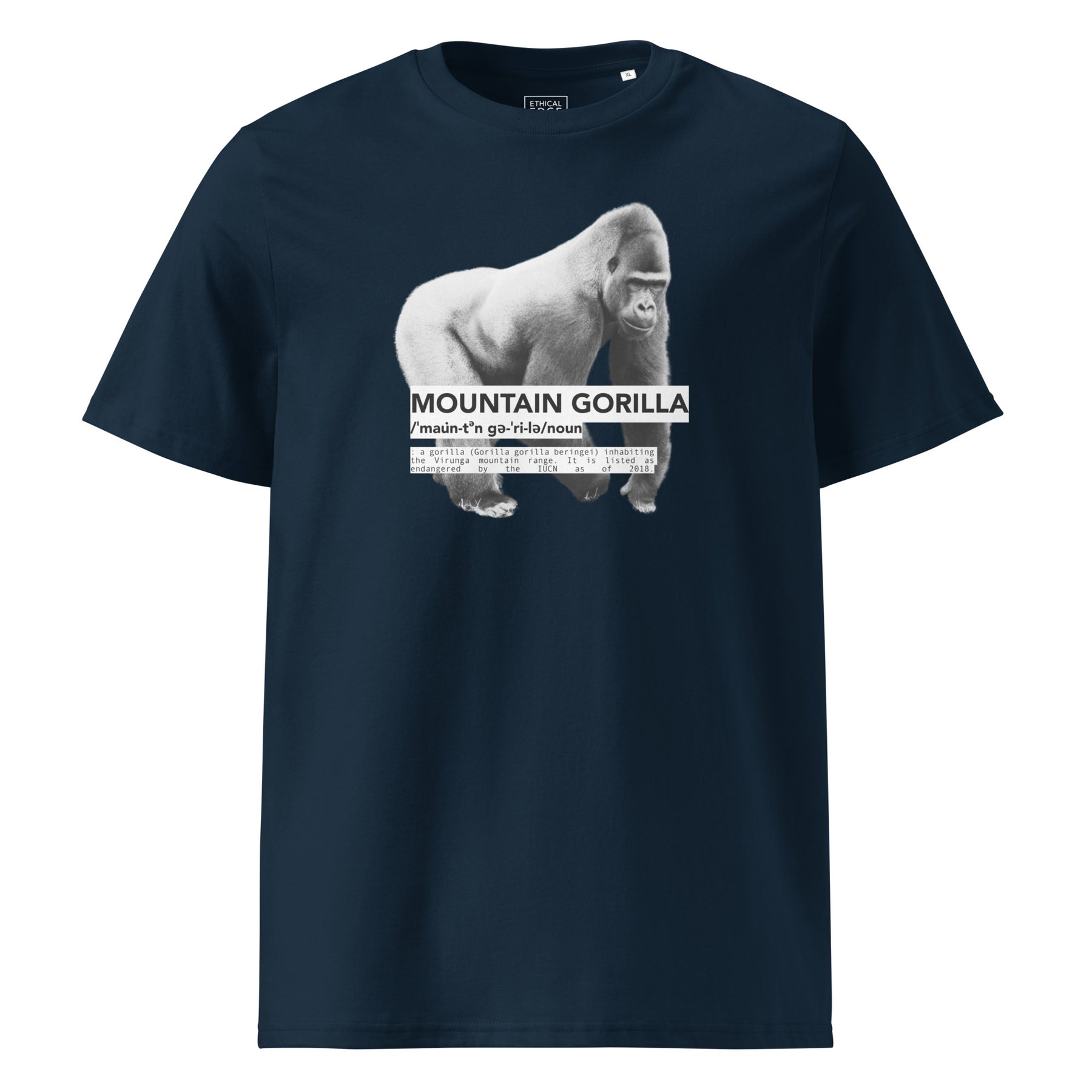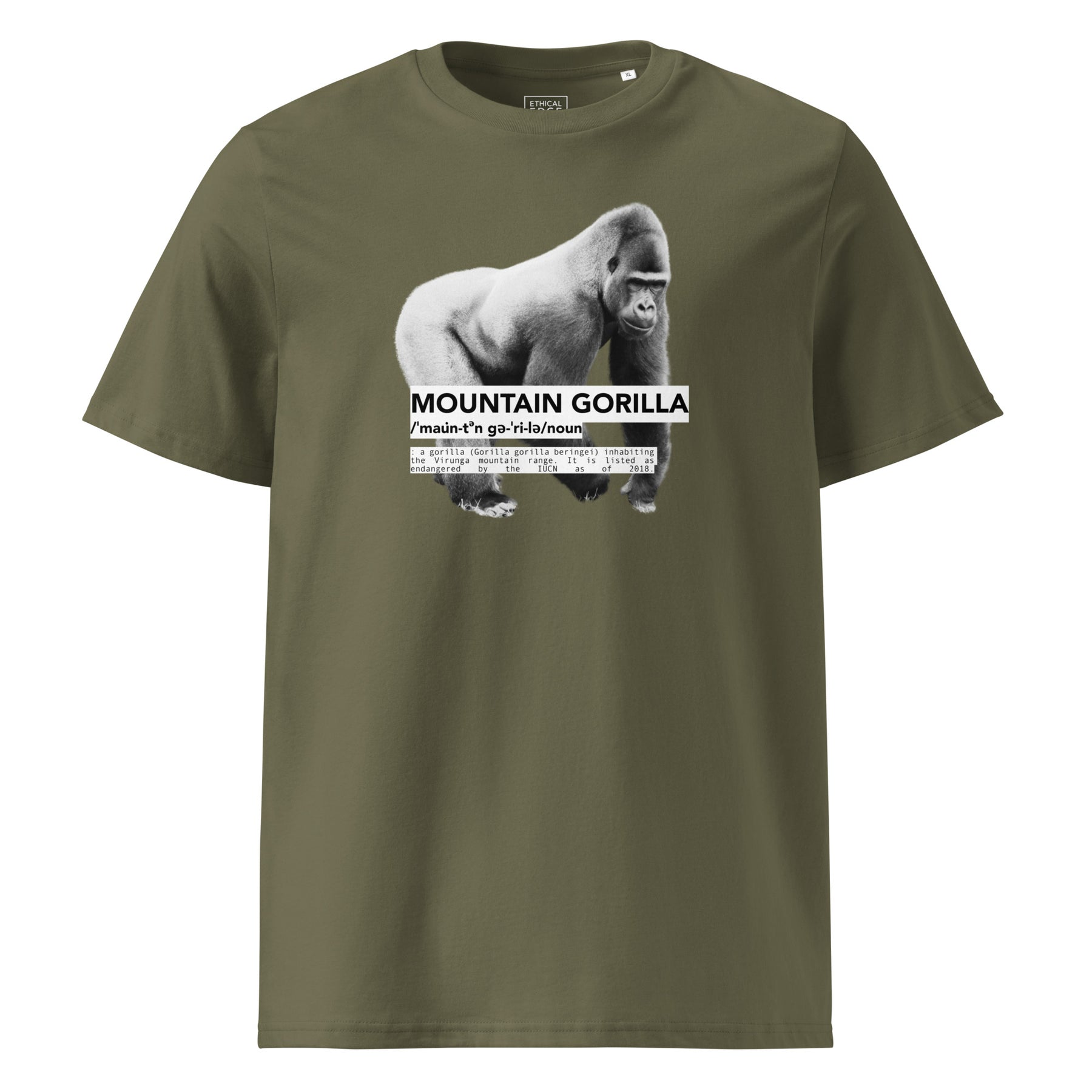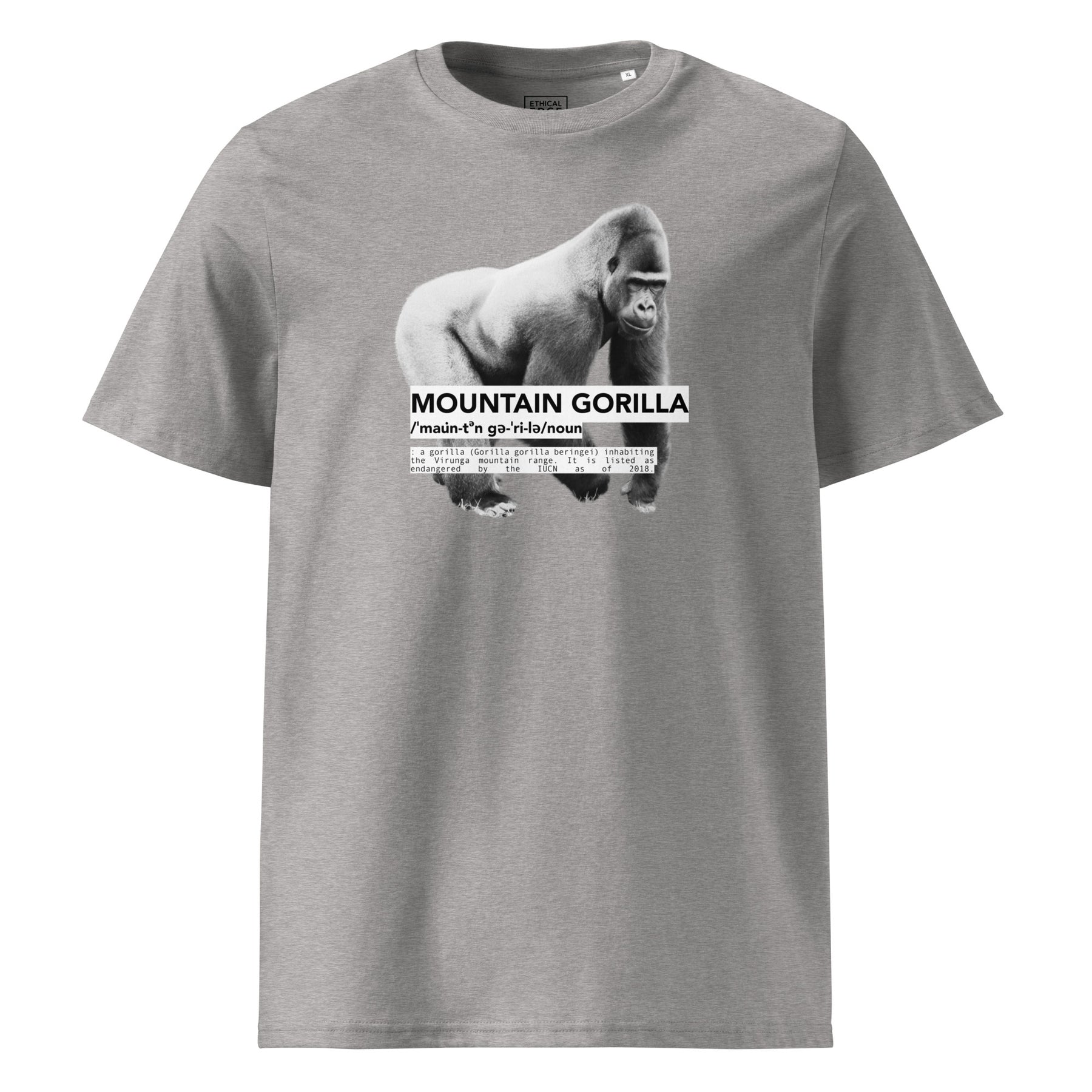 Featuring an illustration of the critically endangered Gorilla with its dictionary-style definition—this design is part of our Endangered Series. Fewer than 1,000 mountain gorillas remain in the wild. Extinction is preventable. Awareness is part of the solution.